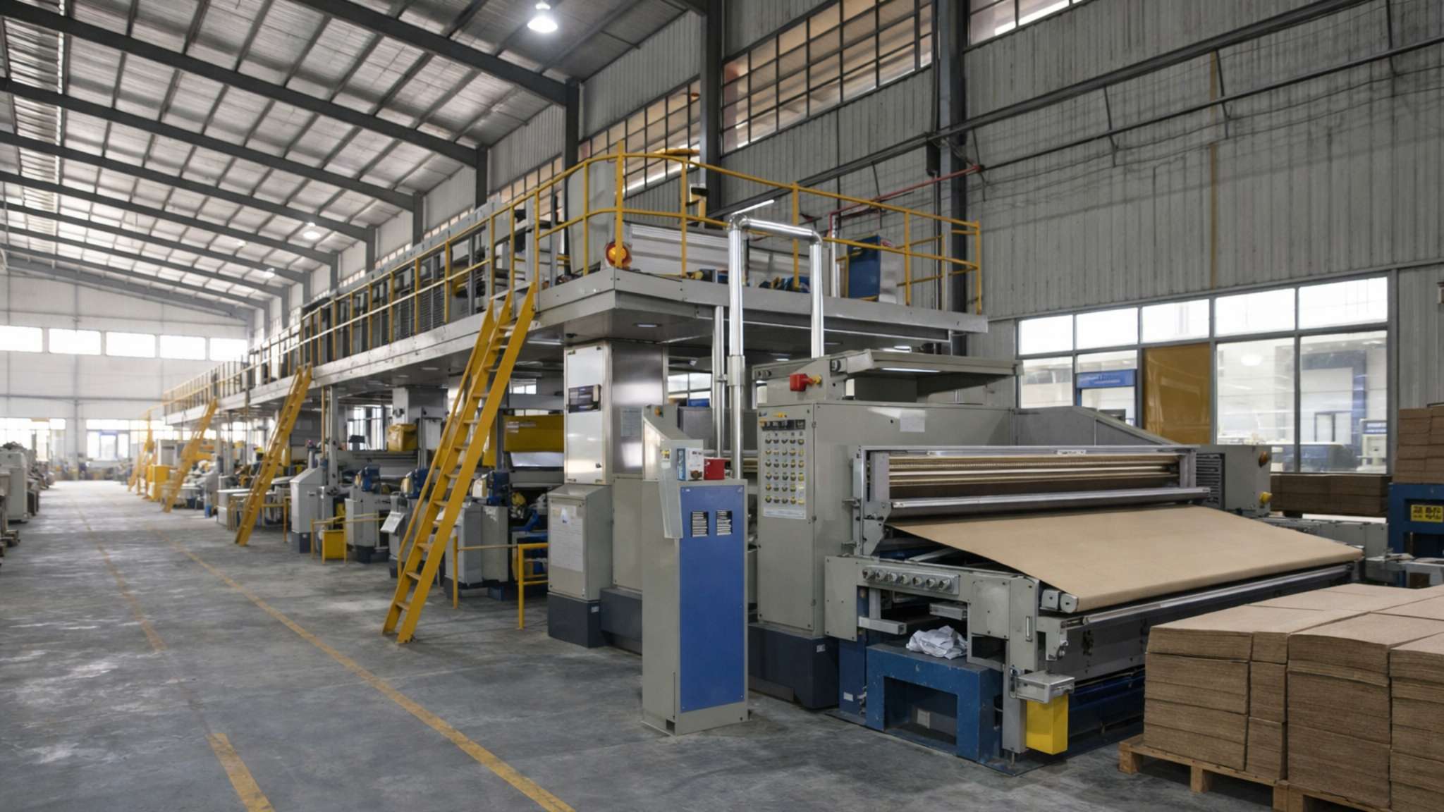 Dây chuyền sản xuất carton sóng tự động, từ giấy cuộn → tạo sóng → dán lớp → cắt định hình, đảm bảo thùng carton có độ chịu lực cao, kích thước chính xác.