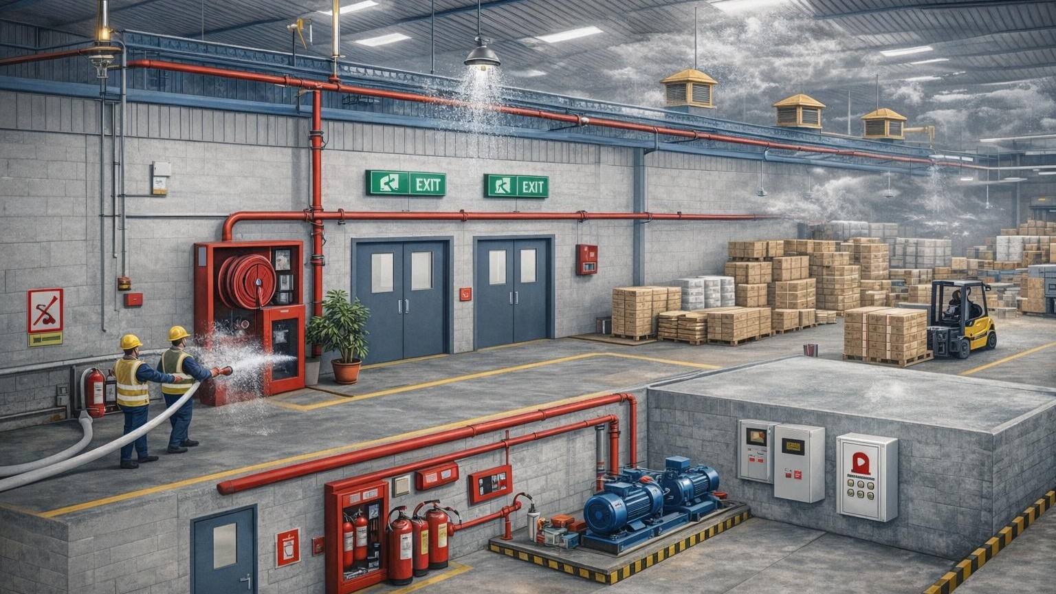 Cấp nước chữa cháy: bể nước dự trữ, bơm áp lực, họng/trụ chữa cháy bố trí dễ tiếp cận.