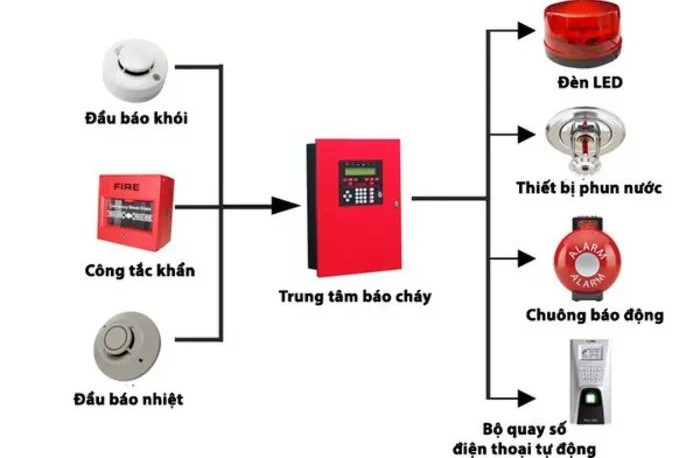 Gồm đầu báo khói/nhiệt, trung tâm báo cháy, chuông – còi – đèn báo.